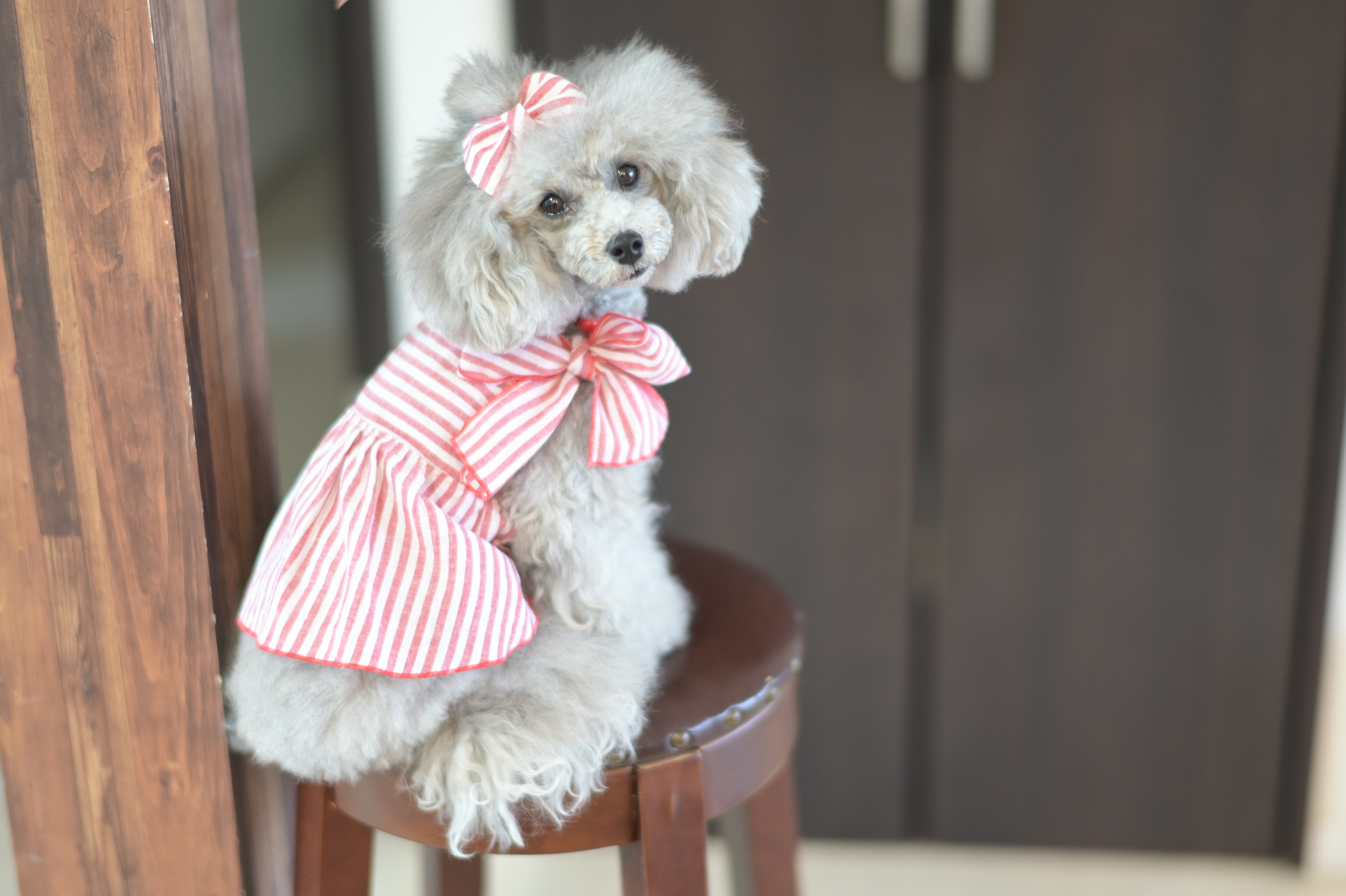 胸部分、スカート部分にはギャザーをたっぷり入れ軽やかさを出してあり、首のリボンにもたっぷり生地を使い、空気の入ったふんわりしたリボンにしました。